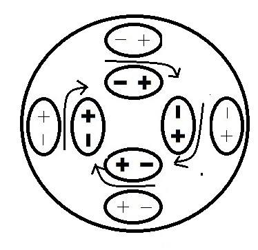 When you pass a wire between a North and South pole, it generates a current in a wire. The direction of the current depends on the direction that you are passing the wire through. We will consider the wire travelling from the bottom to the top of the diagram. The diagarm shows a cross-section of the magnetic field between the magnets. The field is a circular polarization of the dipoles where the stronger dipoles are shown in bold in the center. The reason why a current is generated is because when an electron in the wire comes into the field from the bottom, it initially sees a force to the right (it is attracted to the positive charge). When it passes through the middle, it gets a double push to the right because on the left it is attracted to the big positive charge and on the right it is repelled by the big negative charge. As it goes past the middle, it sees a force to the left. This cancels out the initial force to the right, but does not cancel out the double push to the right provided by the center. Therefore, the electron sees a net force to the right and a current flows as the wire is passed through the magnetic field.