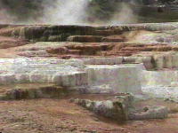 April 27, 1996 - Mammoth hot springs - they sure are! We wander about the colorful terraced landscape. After leaving Yellowstone, it starts snowing and then hailing. It sure looks a lot like winter here.