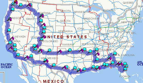 This is the route I took on my RV Adventure. The blue push pins represent where I stopped each day. The purple flags are approximately where you would stop if you drove from 9:00AM-5:00PM every day. I ended up driving only half this amount each day. The map and route were created by the Rand McNally TripMaker 1996 Edition. I found this software useful for setting up the general trip route. However, it wasn't much use in planning exact time/date stops. The amount of driving varied too much to be able to plan ahead.