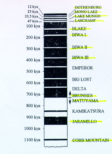 | One possible prediction of this theory is that the magnetic field should be tied to major climactic changes. If the direction of the winds were to be substantially reversed, we could see a reversal of the magnetic field. There is evidence to suggest that magnetic reversals do happen during periods of dramatic climate change. The following graphic shows a chart of the magnetic reversals over the past million years. The yellow highlighted names are when ice ages coincided with a change in the magnetic field direction. There have been at least 12 ice ages related to magnetic reversals over the past million years. This graphic comes from: www.iceagenow.com/Magnetic_Reversal_Chart.htm | |||||||||||||||