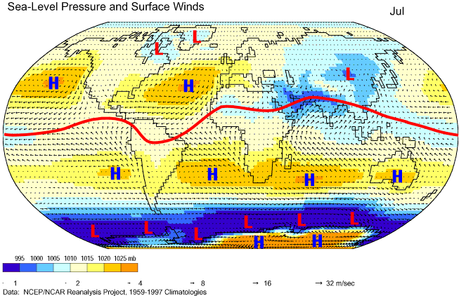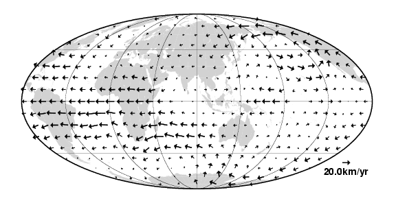 | If you compare these two maps of the Earth, they are not exactly the same, but they share some of the same characteristic circulation patterns due to the position of the continents. You can see similar circulation patterns in the Pacific ocean off the west coast of America. You also see curculation patterns off of Australia and in the Atlantic ocean. The wind direction on Earth changes greatly from season to season and I have only shown a chart of the weather patterns during July, so I wouldn't expect an exact match of the magnetic field movement with any particular wind speed map generated for a particular month. But I would predict that an overall average should come close to matching up with the magnetic field map. While the matchup that can be seen between the magnetic field movement and the wind speed is not exact, I think it is beyond coincidence that the Earth magnetic field map has some of the same circulation patterns and appears to be constrained by the position of the continents. This is evidence that the magnetic field is closely related to the atmospheric wind speed. |