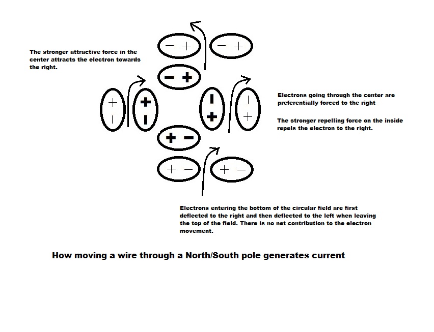 When you pass a wire between a North and South pole, it generates a current in a wire. The direction of the current depends on the direction that you are passing the wire through. We will consider the wire travelling from the bottom to the top of the diagram. The diagarm shows a cross-section of the magnetic field between the magnets. The field is a circular polarization of the dipoles where the stronger dipoles are shown in bold in the center. The reason why a current is generated is because when an electron in the wire comes into the field from the bottom, it initially sees a force to the right (it is attracted to the positive charge). When it passes through the middle, it gets a double push to the right because on the left it is attracted to the big positive charge and on the right it is repelled by the big negative charge. As it goes past the middle, it sees a force to the left. This cancels out the initial force to the right, but does not cancel out the double push to the right provided by the center. Therefore, the electron sees a net force to the right and a current flows as the wire is passed through the magnetic field.